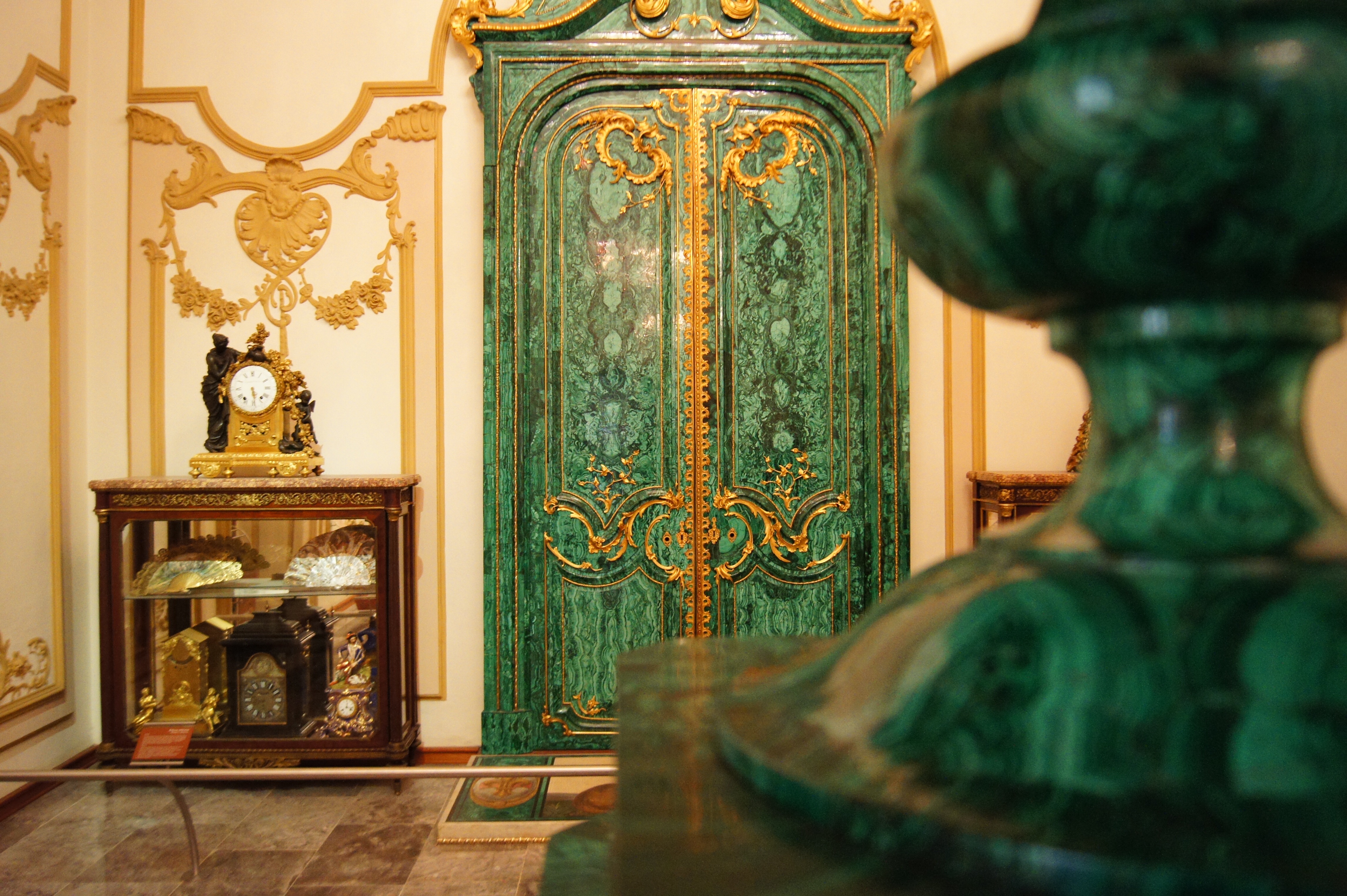 During the XVII century, large deposits of malachite and other minerals were discovered in the Ural Mountains, Russia. XVIII century became a turning point with respect to malachite as a result of the establishments of Yekaterinburg city and Gumyoshevsky mine, where specimens weighing 1500 – 2000 kg (3300-4400 lbs) were mined. By the end of 1800s, two lapidary factories in the Ural region and one near Saint Petersburg have worked to fulfill the orders of the royal family and their reigning officials. Czarist Russia used malachite generously to adorn their cathedrals. Talented and skillful Russian artisans have produced a variety of incredibly elegant artworks that were intended for the halls of the Winter Palace and gifts to foreign monarchs.